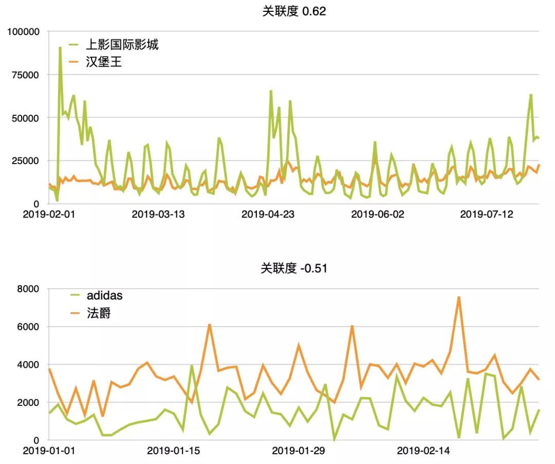 相關性分析可以在眾多數據中找到兩個不同品牌、樓層的統一性,從而確定兩者是否存在強相關。舉例來說,可以分析兩個位置不相關、品類不相關的品牌,在銷售周期區間是否有同樣的銷售波動曲線。