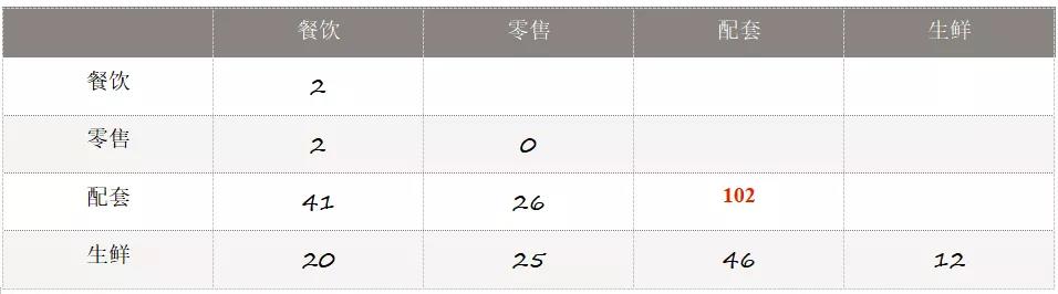 從上圖可以看出,餐飲則與其他業態關聯性不強,這可以判斷餐飲客人的消費習慣并不和其他品牌相關;另一方面,配套業態品牌內循環非常強烈,說明該品類客群內部消化情況很重,同時對于其他品類也有貢獻;最后零售業內部關聯數量為0,則說明這個品類的客群有可能是非常不同的。綜上均需要進一步分析,以便于得到更完整的結論。