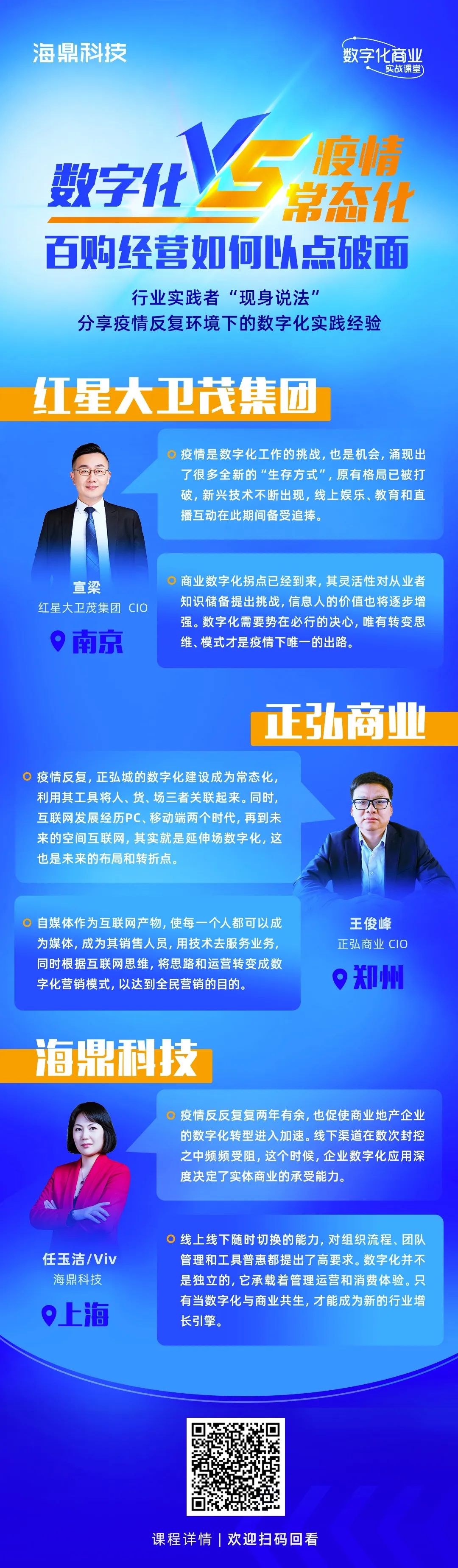 在此大環境下,海鼎科技于5月27日舉辦數字化商業實戰課堂第五期——《數字化VS疫情常態化·百購經營如何以點破面》經營專題系列課程,此次線上課堂邀請紅星大衛茂集團CIO宣梁、正弘商業CIO王俊峰“現身說法”,分享疫情反復環境下的數字化實踐經驗。