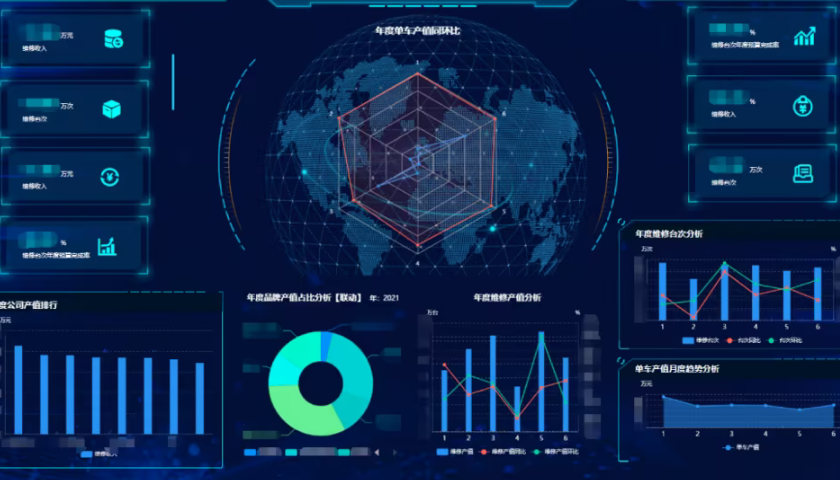 大屏幕可視化效果,畫面很酷,適合放在企業大廳的大屏幕上。也可以放在領導辦公室用大電視呈現,重要的管理指標一目了然。