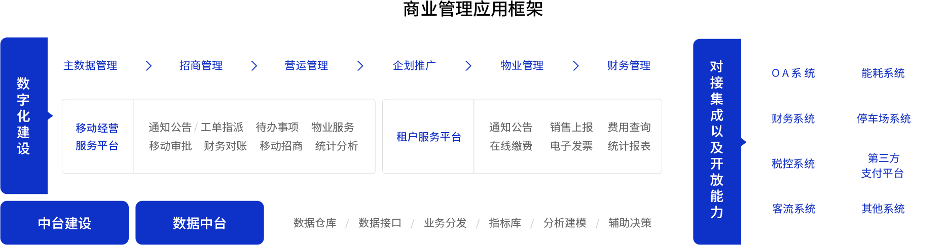 25年+專注和聚焦商業地產,深耕購物中心、百貨、寫字樓、社區商業等多業態,憑借數據及技術優勢,通過平臺、場景、數據和服務四大模塊助力,賦能招商、營運、物業、財務、經營分析全場景進行資產管理進行數字化運營體系建設。